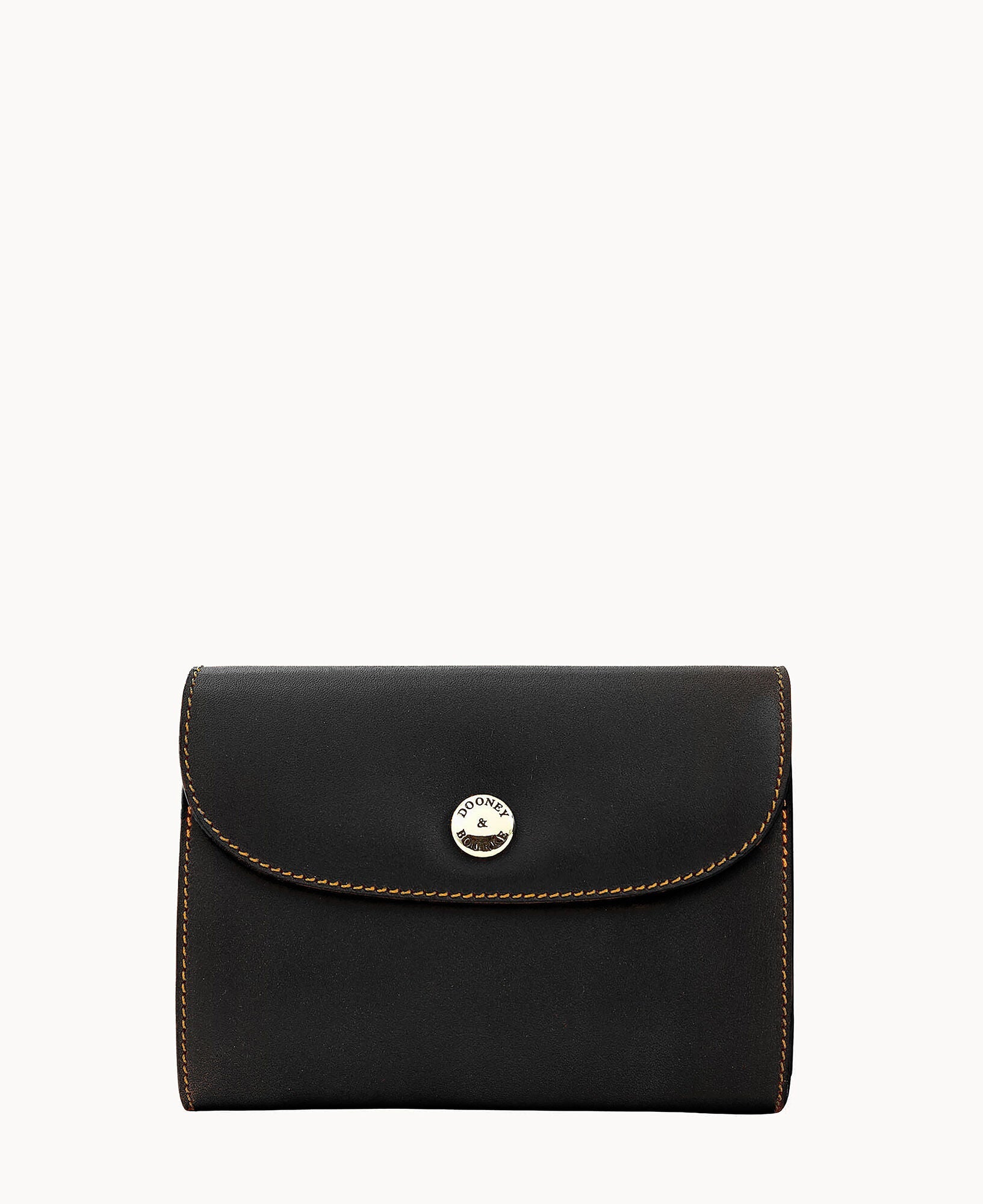 One outside zip pocket. One outside pocket. Six credit card slots. Bill compartment. Two divided pockets. Lined. Snap closure.