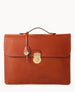 One outside pocket. One outside zip pocket. One inside zip pocket. Two credit card slots. Three pen holder slots. Handle. Lined. Lock and key with fob.