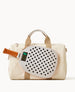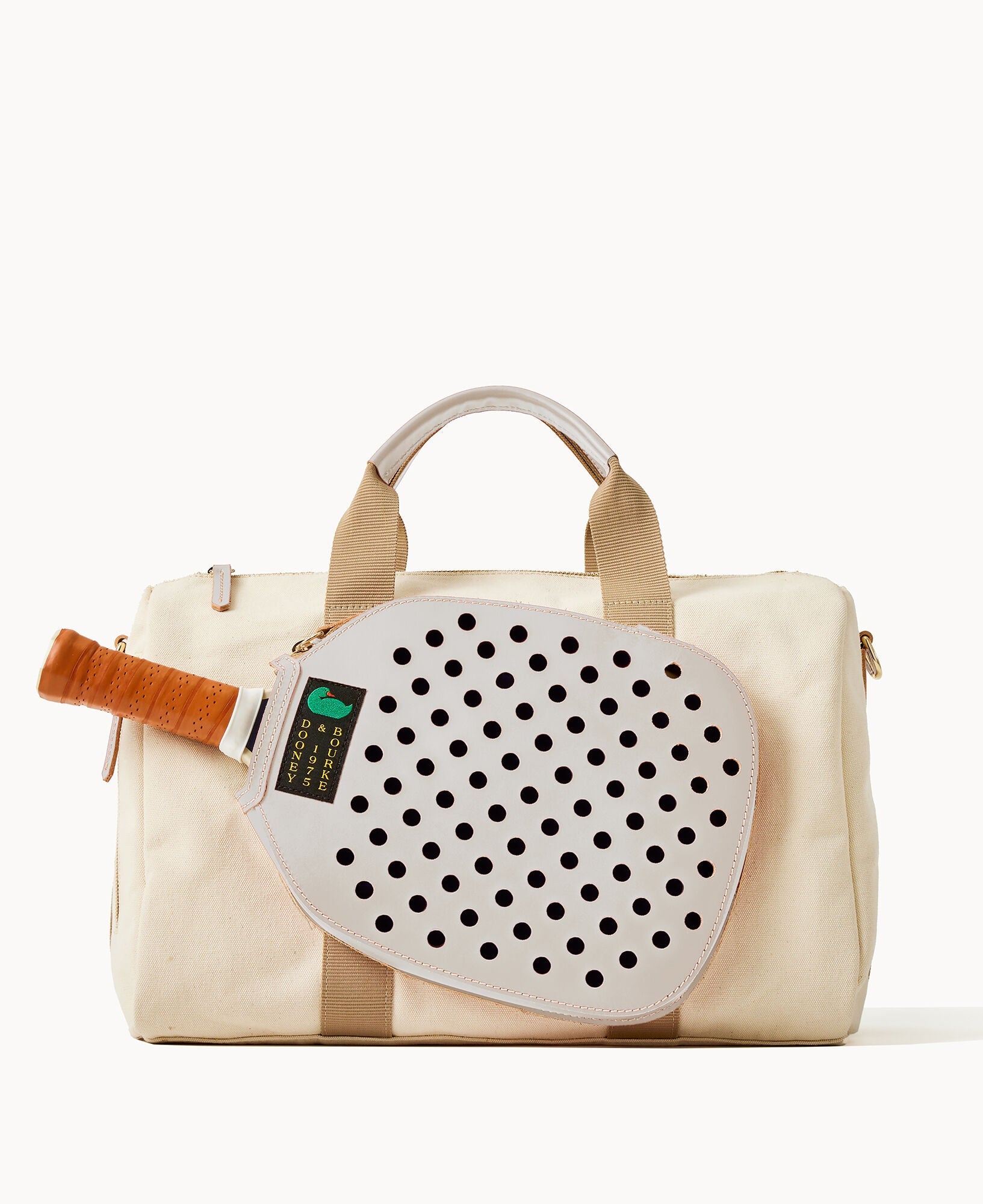 One outside zip pocket. One outside slip pocket. Two interior zip pockets. One racket zip pocket. Zipper closure.