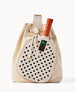 Two outside zip pockets. One inside bottle pocket. Adjustable strap. Drawstring closure.
