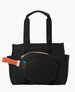 Five outside slip pockets. Two inside slip pockets. Zipper closure.