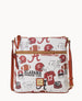 One outside zip pocket. One inside zip pocket. Two inside pockets. Cell phone pocket. Inside key hook. Adjustable shoulder strap. Strap drop length 25". Lined. Zipper closure.