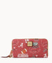 Two compartments. One zip compartment. Twelve credit card slots. Detachable wrist strap. Strap length 7". Lined. Zipper closure.