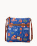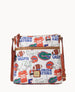 One outside zip pocket. One inside zip pocket. Two inside pockets. Cell phone pocket. Inside key hook. Adjustable shoulder strap. Strap drop length 25". Lined. Zipper closure.