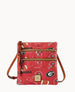 Two outside zip pockets. Cell phone pocket. Adjustable shoulder strap. Strap drop length 24". Lined. Zipper closure.