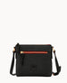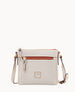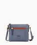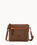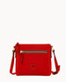 One outside zip pocket. One inside zip pocket. Two inside pockets. Cell phone pocket. Inside key hook. Strap drop length 23". Lined. Zipper closure.