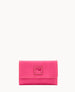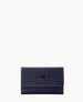 One inside zip pocket. ID window. Billfold compartment. Eight credit card slots. Flap closure.