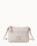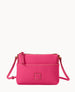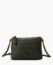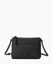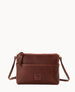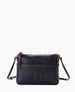 Two outside slip pockets. One inside zip pocket. One inside slip pocket. Inside key hook. Lined. Zipper closure. Strap drop length 28".
