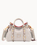 One inside zip pocket. Two inside pockets. Cell phone pocket. Handle drop length 4.5". Adjustable. detachable shoulder strap. Strap drop length 23". Lined. Feet. Zipper closure.