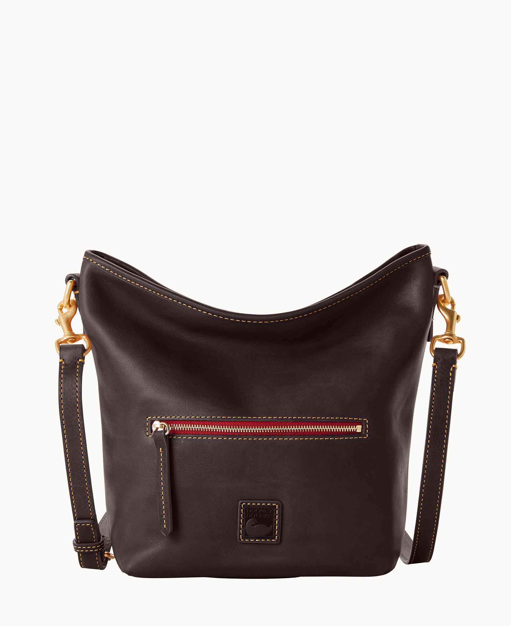 One outside zip pocket. One inside zip pocket. Two inside pockets. Cell phone pocket. Inside key hook. Adjustable. detachable shoulder strap. Feet. Zipper closure.