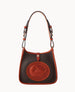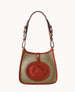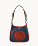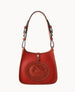 One outside pocket. One inside pocket. Inside key hook. Adjustable shoulder strap. Shoulder strap length 9." Lined. Snap button closure.