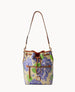 One outside zip pocket. One inside zip pocket. Two inside pockets. Cell phone pocket. Inside key hook. Detachable shoulder strap. Strap drop length 13". Lined. Feet. Drawstring closure.