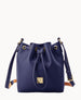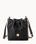 One inside pocket. One inside zip pocket. Inside key hook. Strap drop length 24.5". Drawstring closure. Lined.