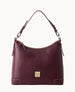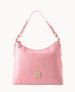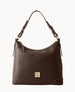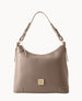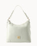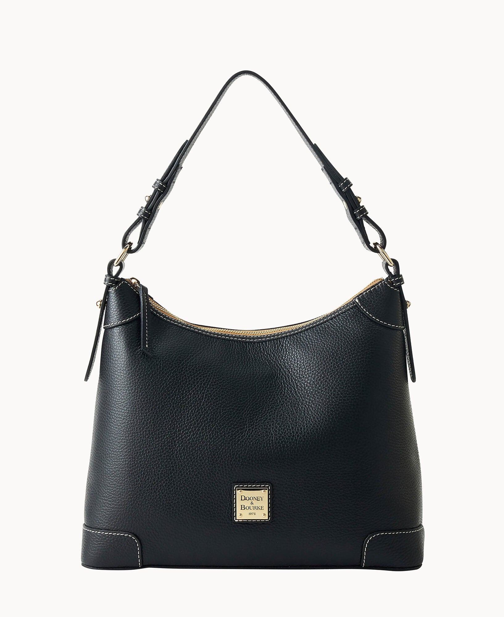 One inside zip pocket. Two inside pockets. Cell phone pocket. Inside key hook. Handle drop length 7.5". Adjustable shoulder strap. Strap drop length 8". Lined. Feet. Zipper closure.