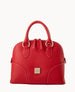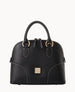 Three inside pockets. One inside zip pocket. One inside key hook. Handle drop length 5". Strap drop length 27.5". Zipper closure. Feet. Lined.