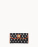 One outside zip pocket. One inside pocket. License pocket with window. Two bill compartments. Seven credit card slots. Lined. Feet. Snap closure.
