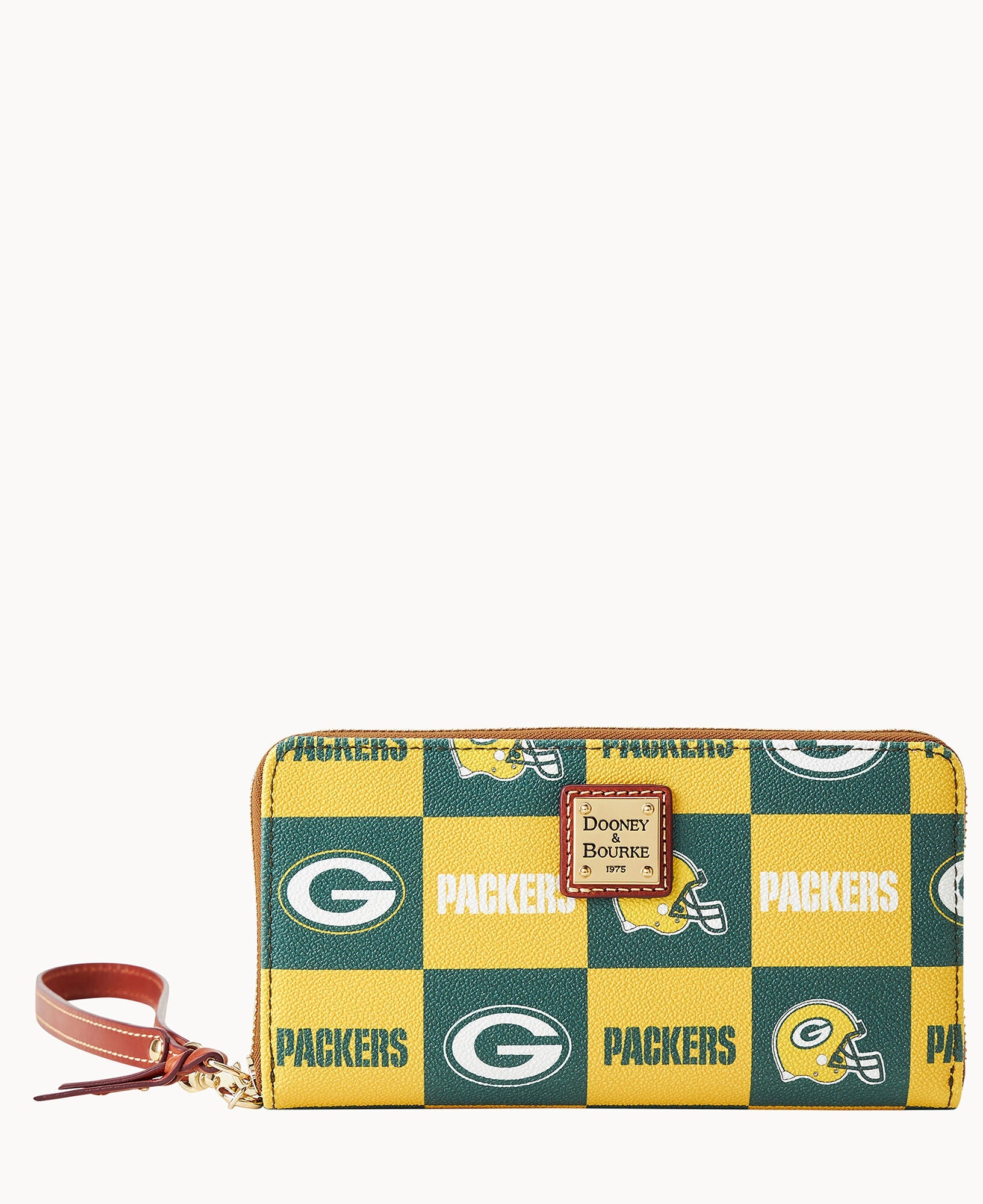 Two compartments. One zip compartment. Twelve credit card slots. Detachable wrist strap. Strap length 7". Lined. Zipper closure.
