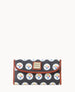 One outside zip pocket. One inside pocket. License pocket with window. Two bill compartments. Seven credit card slots. Lined. Feet. Snap closure.