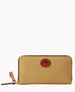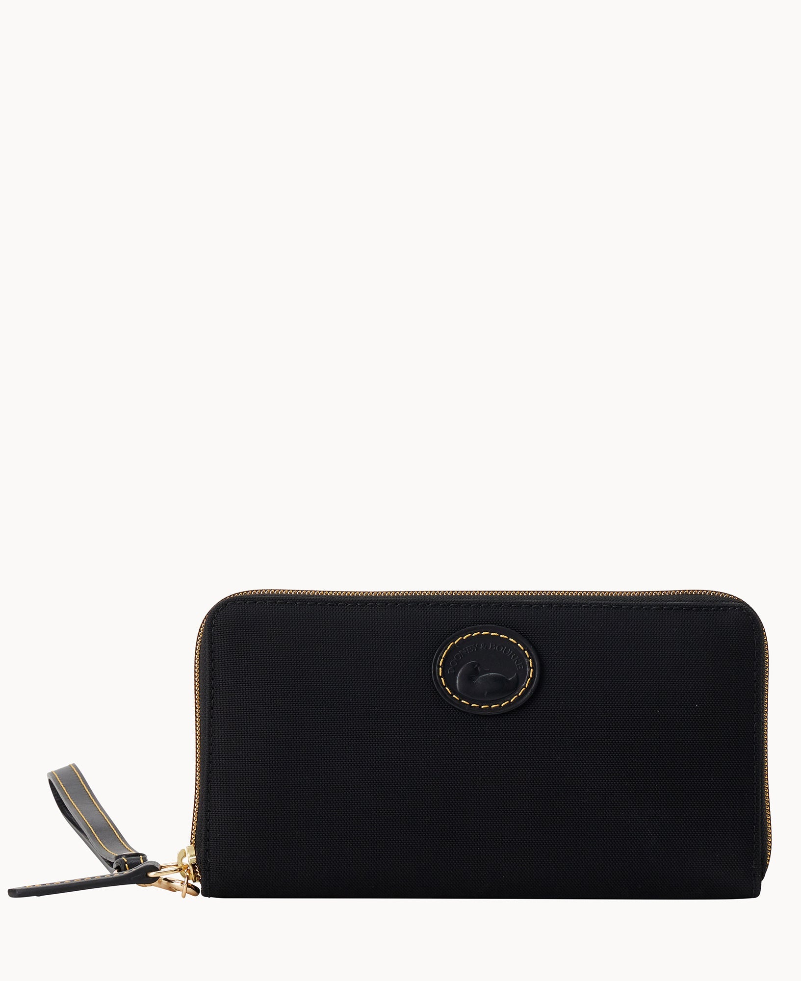 Two compartments. One zip compartment. Twelve credit card slots. Detachable wrist strap. Strap length 7". Lined. Zipper closure.
