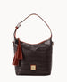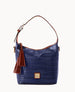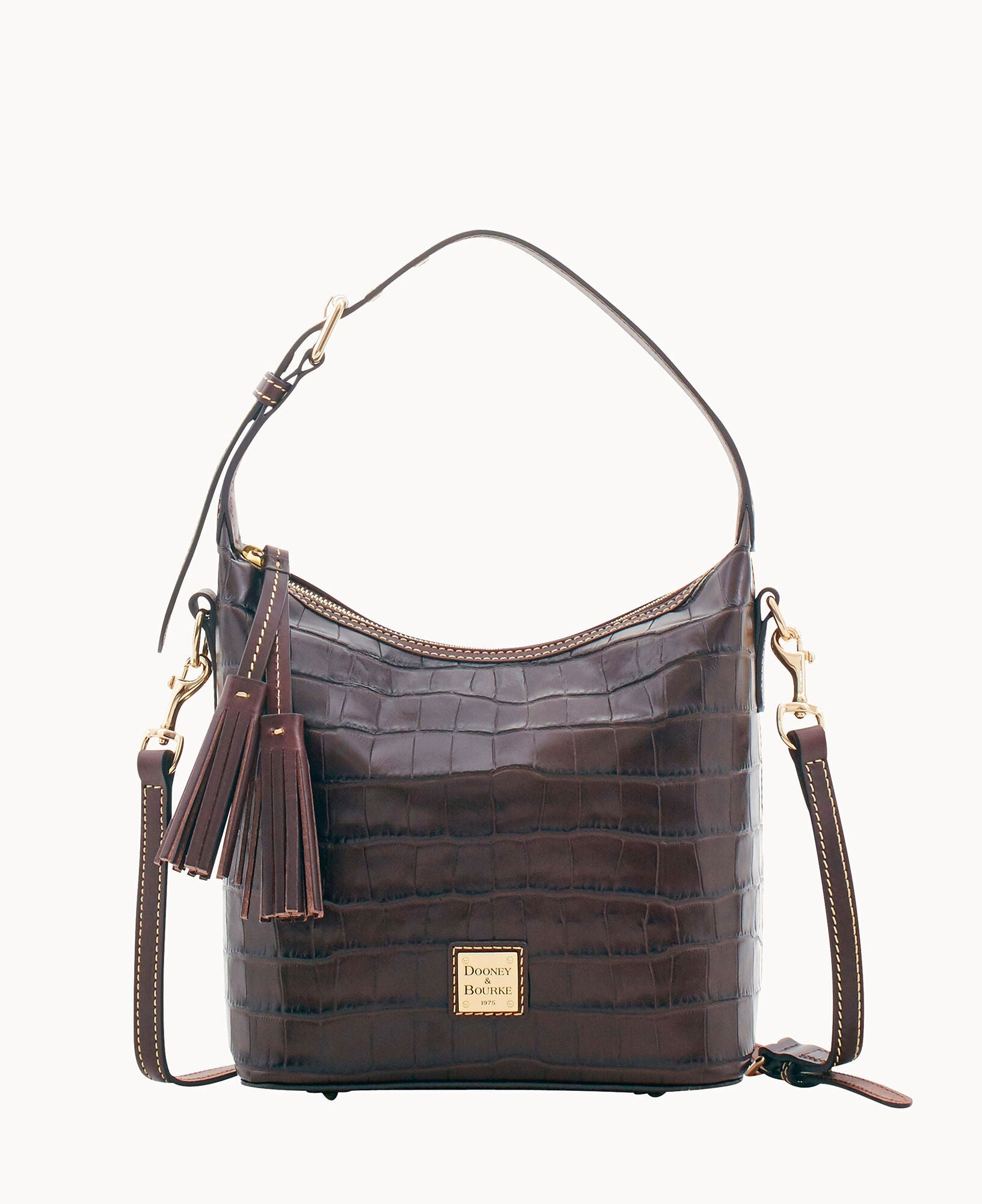Two inside pockets. One inside zip pocket. Cell phone pocket. Inside key hook. Handle drop length 8". Adjustable shoulder strap. Strap drop length 29". Lined. Feet. Zipper closure.