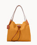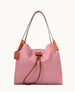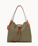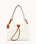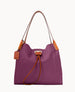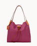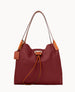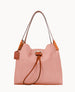 Two inside pockets. Inside key hook. Strap drop length 5". Drawstring closure.