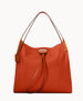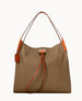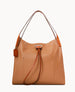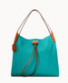 Two inside pockets. Inside key hook. Strap drop length 11". Drawstring closure.