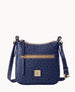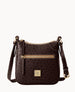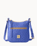 One outside zipper pocket. One inside pocket. One inside zipper pocket. Inside key hook. Lined. Zipper closure. Adjustable strap. Strap drop length 26".