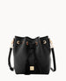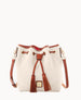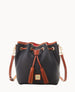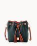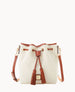 One inside zip pocket. Two inside pockets. Cell phone pocket. Inside key hook. Adjustable. detachable shoulder strap. Strap drop length 28". Lined. Feet. Drawstring closure.