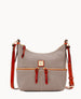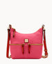 Two outside zip pockets. One inside zip pocket. Two inside pockets. Cell phone pocket. Inside key hook. Strap drop length 27". Lined. Zipper closure.