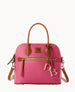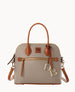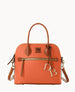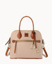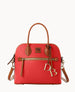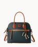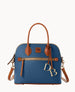 One outside zip pocket. Two inside slip pockets. One inside phone pocket. Inside key hook. Adjustable strap. Detachable strap. Strap drop length 23". Handle drop length 4.5". Feet. Lined. Zipper closure. Removable DB medallion.