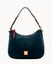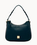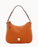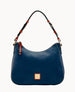One outside zip pocket. One inside zip pocket. Two inside pockets. Cell phone pocket. Inside key hook. Adjustable handle. Handle drop length 9.5". Lined. Zipper closure.