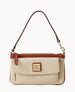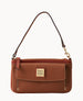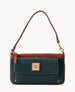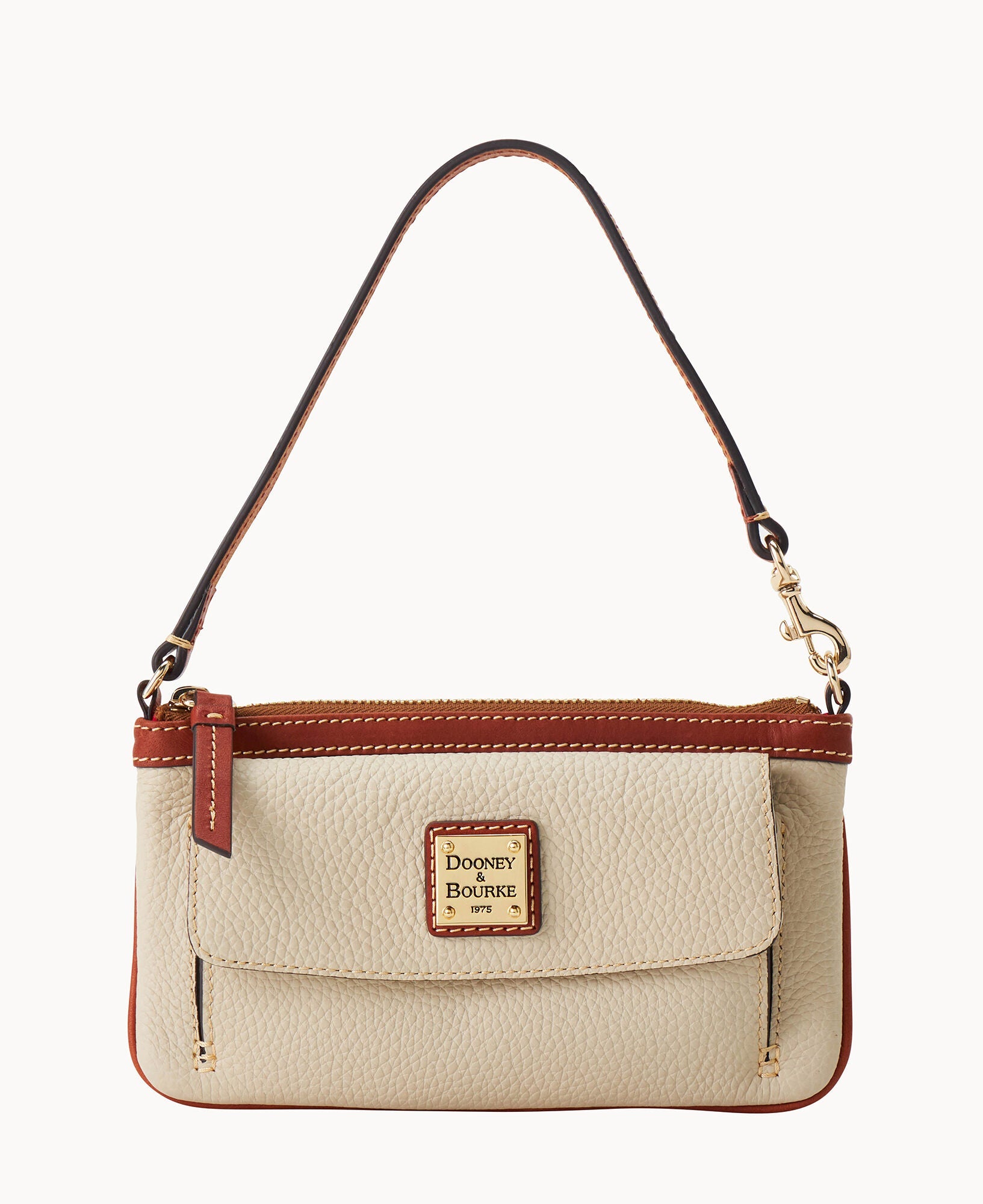 One outside snap pocket. Inside divider pocket. Strap drop length 6.5". Lined. Zipper closure.