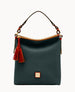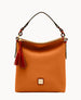 One inside zip pocket. Two inside pockets. Cell phone pocket. Inside key hook. Handle drop length 12". Lined. Feet. Zipper closure.