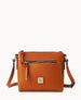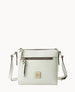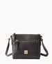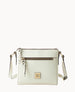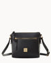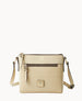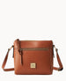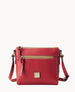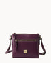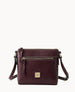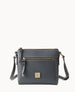 One outside zip pocket. One inside zip pocket. Two inside pockets. Cell phone pocket. Inside key hook. Strap drop length 23". Lined. Zipper closure.