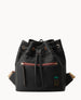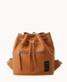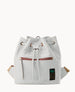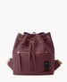 One outside zip pocket. One inside zip pocket. Four inside pockets. Inside key hook. Adjustable shoulder straps. Strap length 11.5". Lined. Drawstring closure.