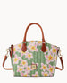 One outside pocket. One inside zip pocket. Two inside pockets. Cell phone pocket. Inside key hook. Handle drop length 4.5". Strap drop length 13". Lined. Feet. Zipper closure.