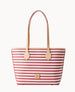 One inside zip pocket. Two inside pockets. Cell phone pocket. Inside key hook. Strap drop length 11". Lined. Feet. Zipper closure.