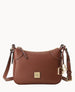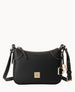One outside zip pocket. One inside zip pocket. One inside pocket. Inside key hook. Strap drop length 24.5". Lined. Removable DB medallion. Zipper closure.