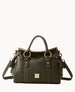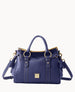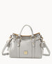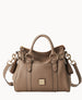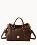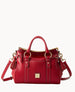 Two outside pockets. One inside zip pocket. Two inside pocket. Cell phone pocket. Inside key hook. Feet. Lined. Zipper closure. Adjustable. detachable shoulder strap. Strap drop length 22". Handle drop length 5".