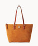 Outside back pocket. One inside zip pocket. Two inside pockets. Cell phone pocket. Inside key hook. Handle drop length 10.5". Lined. Feet. Zipper closure.