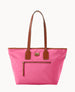 One outside zip pocket. One inside zip pocket. Three inside pockets. Cell phone pocket. Inside key hook. Strap drop length 11.5". Lined. Feet. Zipper closure.