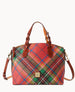 One inside zip pocket. Two inside pockets. Cell phone pocket. Inside key hook. Adjustable. detachable shoulder strap. Strap drop length 25". Lined. Feet. Zipper closure.
